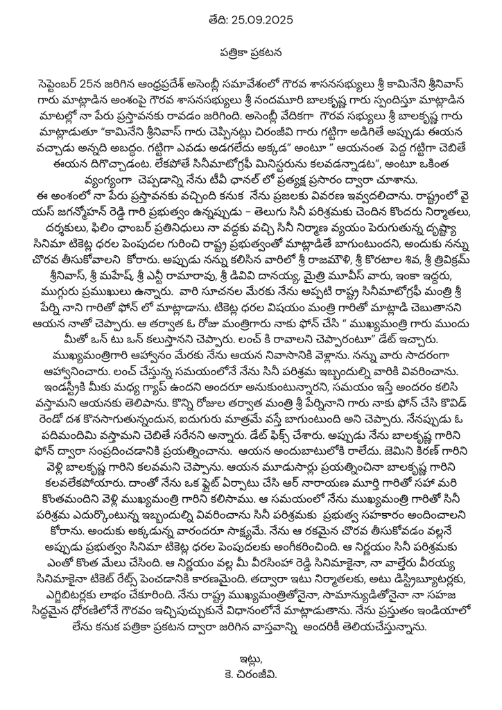 సినీ పరిశ్రమకు ప్రభుత్వ సహకారం కోరినందుకు, ప్రభుత్వం సినిమా టికెట్ల ధరలను పెంచడానికి అంగీకరించింది. ఆ నిర్ణయంతోనే కొన్ని సినిమాల టికెట్ రేట్లు పెరిగి, నిర్మాతలు, డిస్ట్రిబ్యూటర్లు, ఎగ్జిబిటర్లకు లాభం చేకూరిందని చిరంజీవి చెప్పారు. తన సహజ సిద్ధమైన, గౌరవపూర్వక ధోరణిలో తాను మీడియా, సామాన్యులతో మాట్లాడుతానని, దేశంలో లేని కారణంతో పత్రికా ప్రకటన ద్వారా వాస్తవాన్ని అందరికీ తెలియచేస్తున్నానన్నారు.