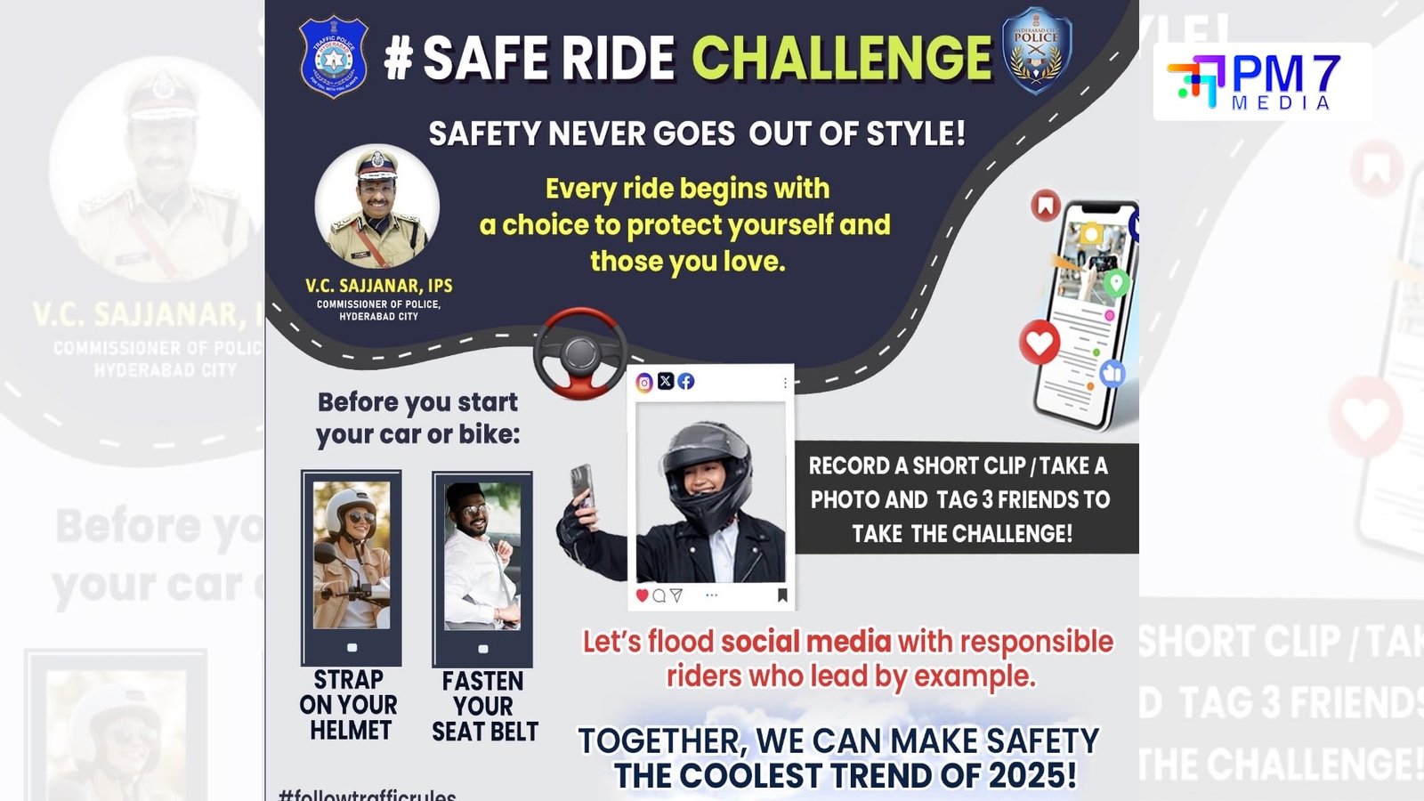 హైదరాబాద్ సీపీ వీసీ సజ్జనార్ తాజాగా ప్రారంభించిన “సేఫ్ రైడ్ ఛాలెంజ్” (SafeRideChallenge) కార్యక్రమం రోడ్డు భద్రతపై ప్రజల అవగాహనను పెంచేందుకు ఒక కొత్త దిశగా మారింది. ఈ కార్యక్రమం ద్వారా వాహనదారులు ప్రయాణం ప్రారంభించే ముందు హెల్మెట్ ధరించడం, సీట్బెల్ట్ పెట్టుకోవడం వంటి భద్రతా చర్యలను పాటిస్తూ ఒక చిన్న వీడియో లేదా ఫోటో తీసి, తమ ముగ్గురు స్నేహితులను లేదా కుటుంబ సభ్యులను ట్యాగ్ చేసి సోషల్ మీడియాలో పోస్ట్ చేయాలని కోరుతున్నారు.